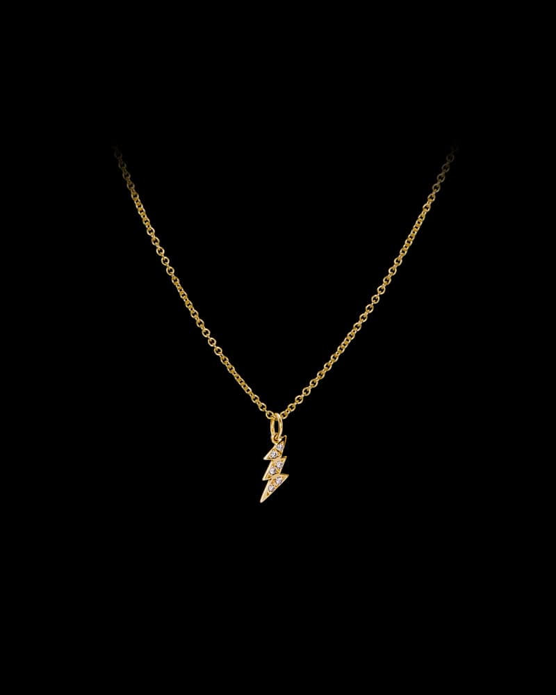 Yellow gold diamond necklace with a lightning-shaped pendant adorned with small diamonds on a chain with round links.